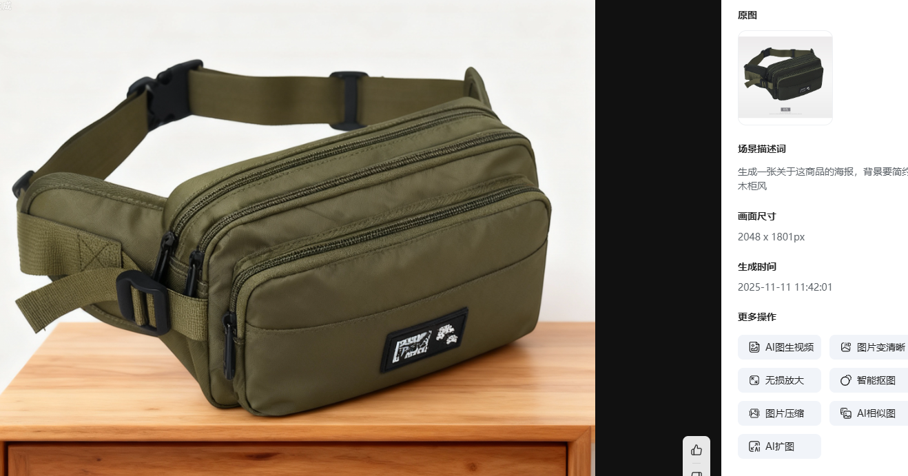 平庸的提示词:挎包海报(AI可能会生成一张简单的产品白底图,毫无吸引力)