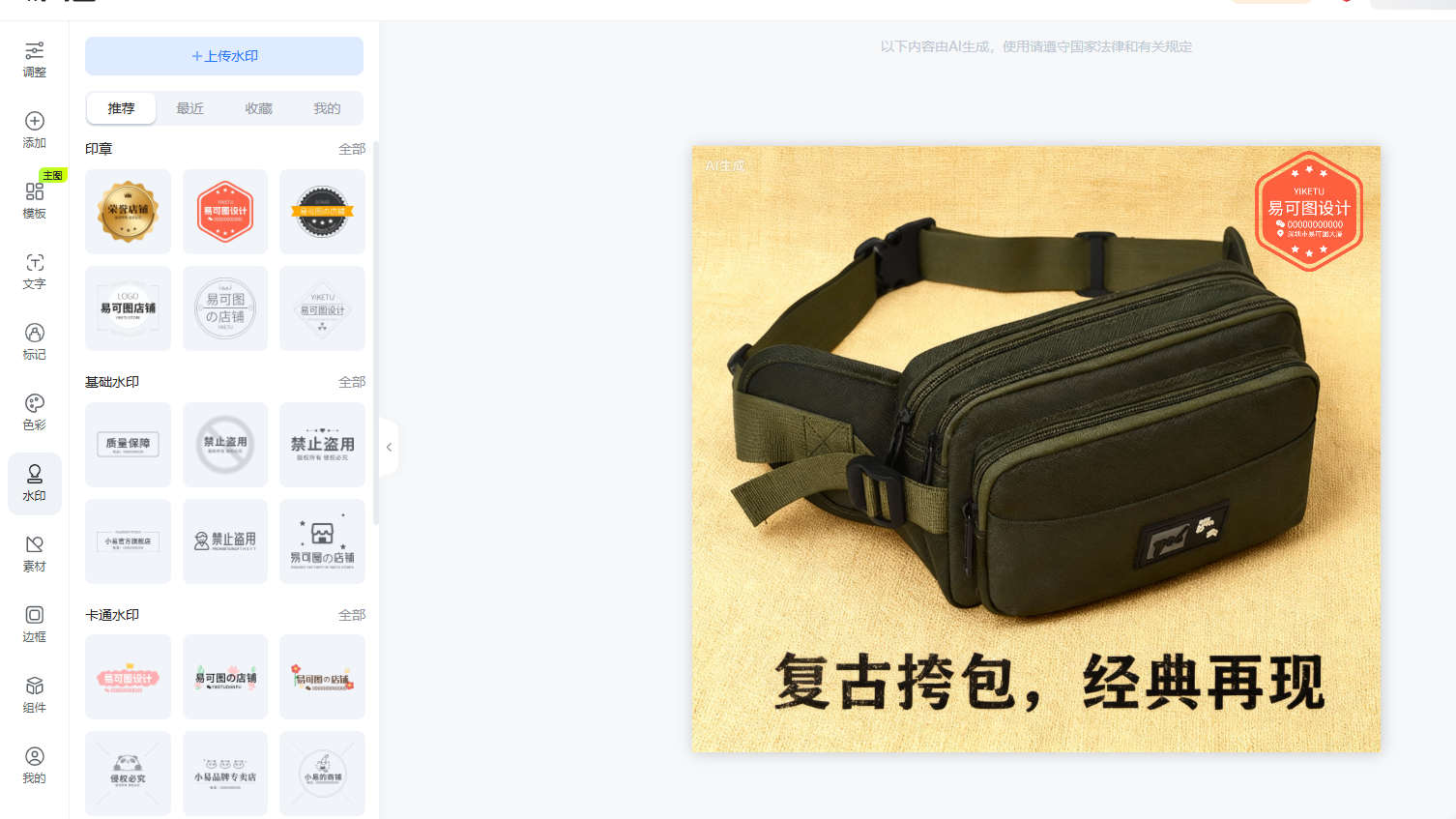 剩下的就只是要加上logo而已,这个也是比较轻松的一个部分。我们也可以直接把生成好的图片拖入到易可图中的图片编辑器里面来进行一些二次修改操作。需要注意的地方就是: