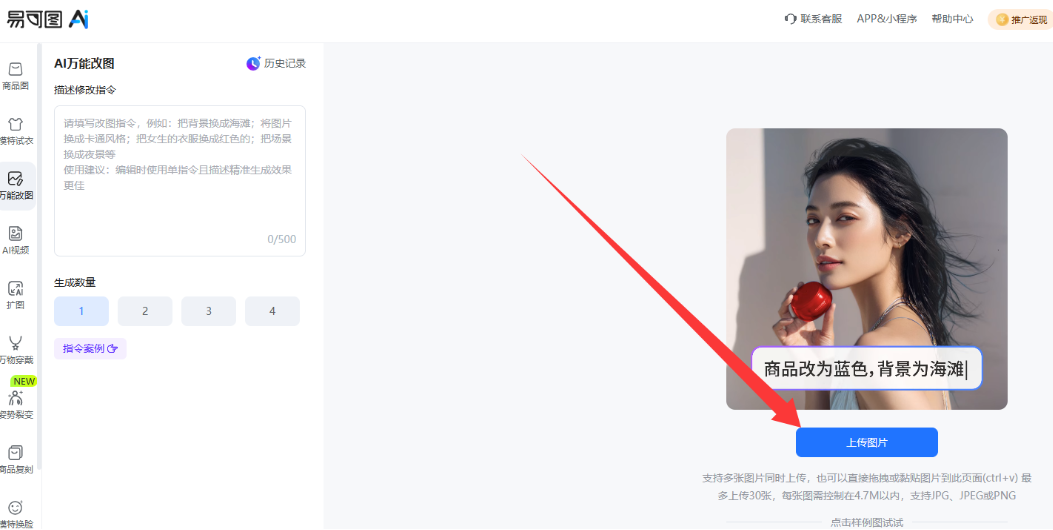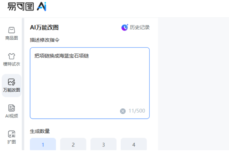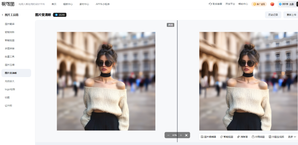 易可图平台有两个功能都可以帮我们修复图片,让图片变高清,一个是万能改图功能,另一个是图片变清晰功能,具体使用方法如下: