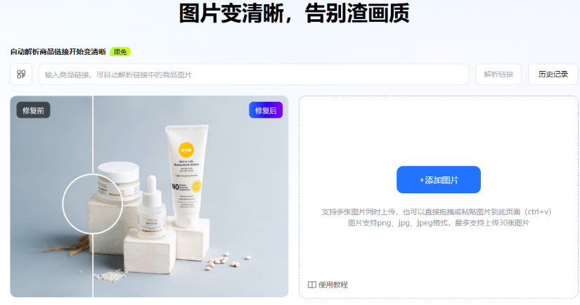 ①上传图片:进入图片变清晰页面后,点击【+添加图片】按钮上传模糊图片。
