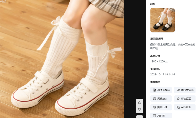 替换款式:“把模特脚上的黑色皮鞋,替换成白色帆布鞋”