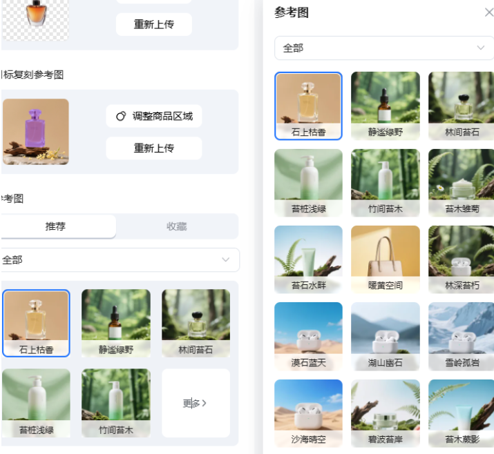 在「目标复刻参考图」上传区,您可以上传您所希望得到的背景风格图片作为目标,既可以直接上传已准备好的背景图,也可以直接从平台上提供的各种风格模板中选择。目前平台已经提供了一些常用的背景模版供用户挑选,包括但不限于“石上枯香”、“静谧绿野”、“林间苔石”、“苔桩浅绿”、“竹间苔木”。这些背景图涵盖了自然风、极简风、复古风等多个方向,适用于服装类目、配饰类目以及家居类目的背景设定场景。