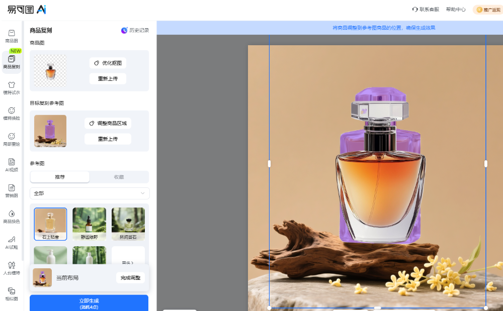 最后,请点击下方的【立即生成】按钮,此时系统将会开始运行,为您生成全新的带有新背景的商品图。