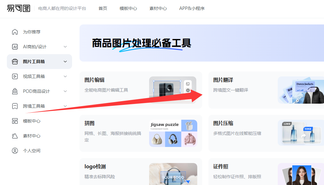 该工具进入方式便捷,可以直接在首页的 “图片工具箱” 中点击 “图片翻译” 功能进入。