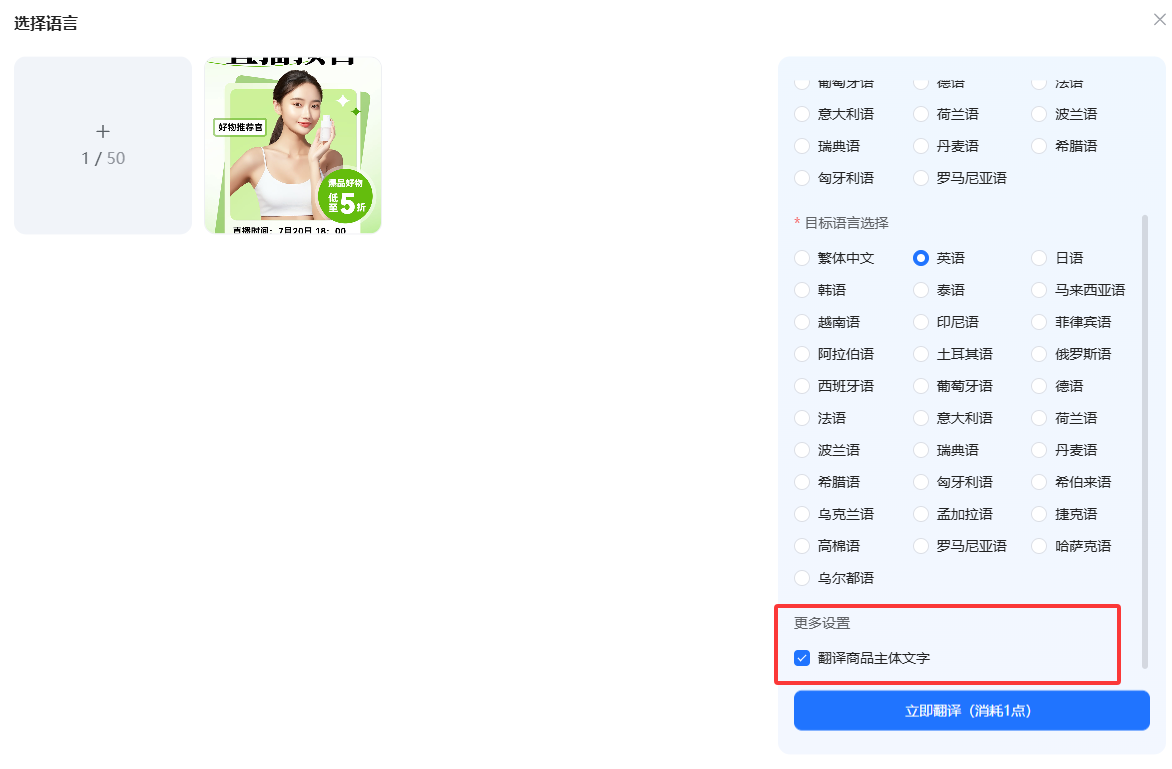 翻译过程简单高效,上传商品图片后,选定原语言和目标语言,在 “更多设置” 中,可根据需求勾选 “翻译商品主体文字”。