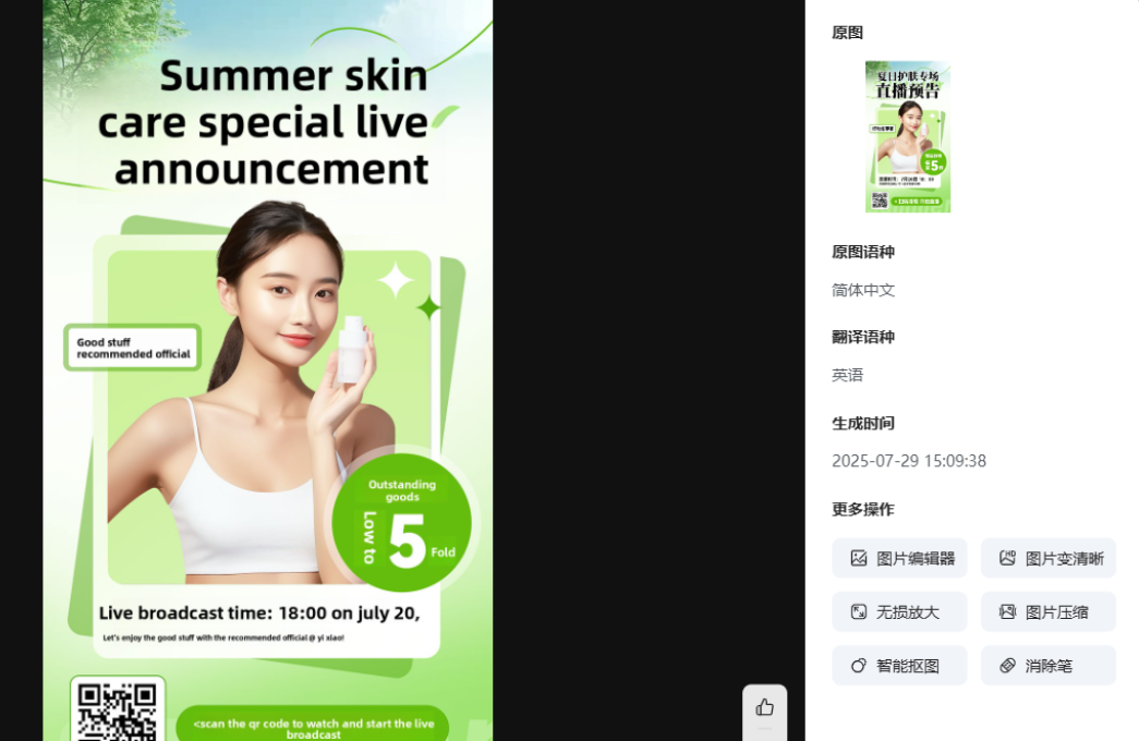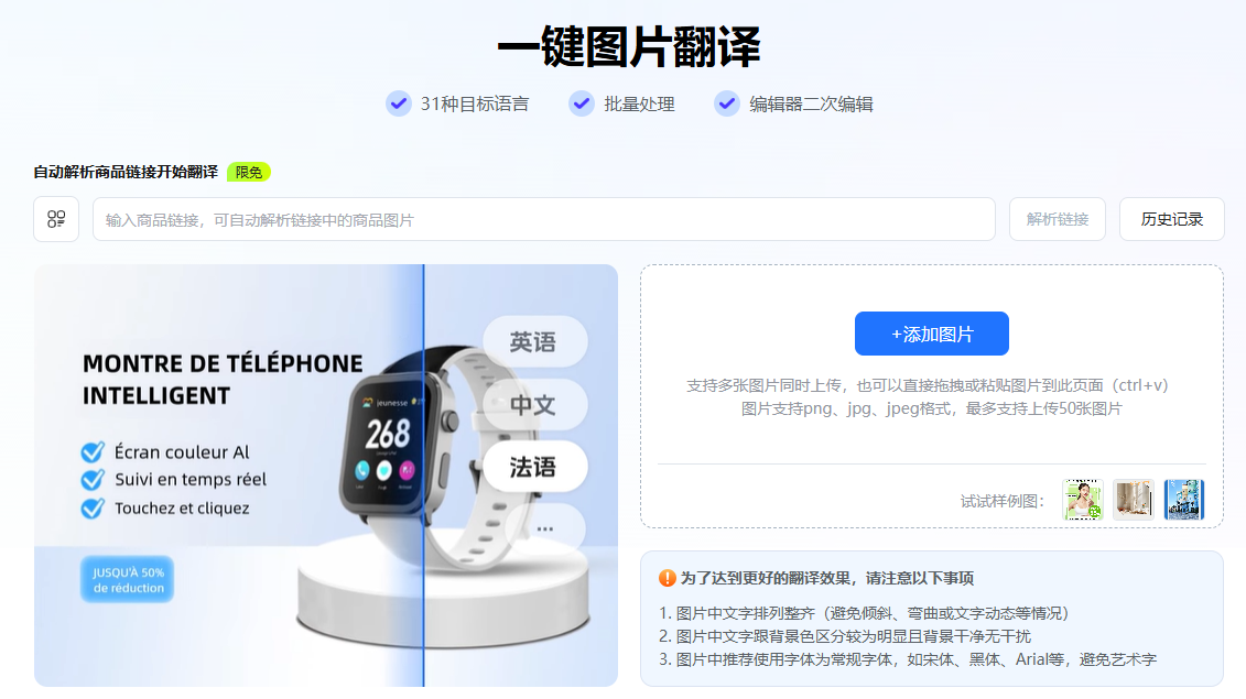 易可图是专为电商人打造的设计与翻译平台,在商品图片翻译方面表现出色,是跨境电商从业者的首选工具。它支持将图片中的文字精准翻译成31 种目标语言,覆盖了全球主要的跨境电商市场。
