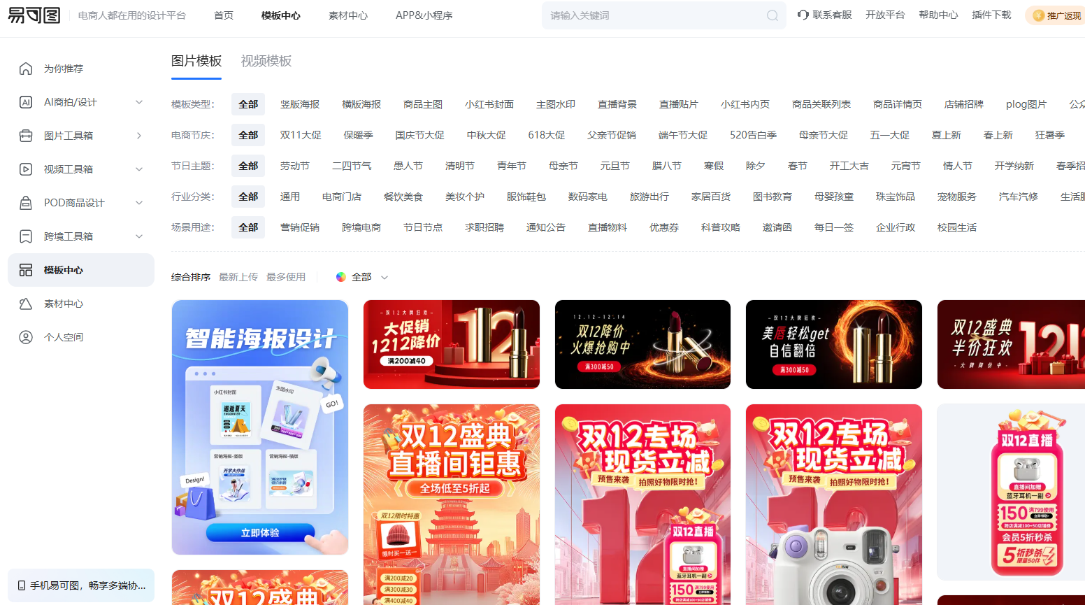 海量模板与设计资源:除了上面提到的一些主要功能以外,易可图本身也内置了大量的海报模板库、电商模板库以及丰富的设计素材供用户调取使用。