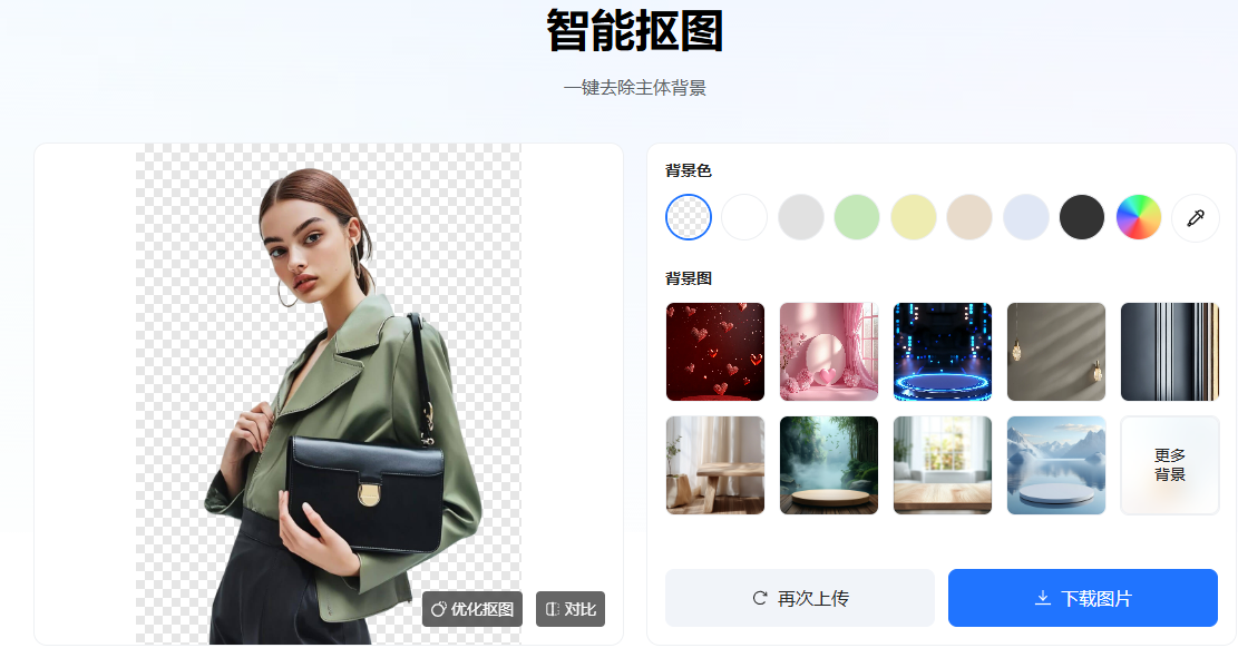 AI抠图: 还有一键智能抠图功能,无论人物肖像类抠图或物品类抠图均能迅速准确地识别主体物边界线,进而快捷去除底色。