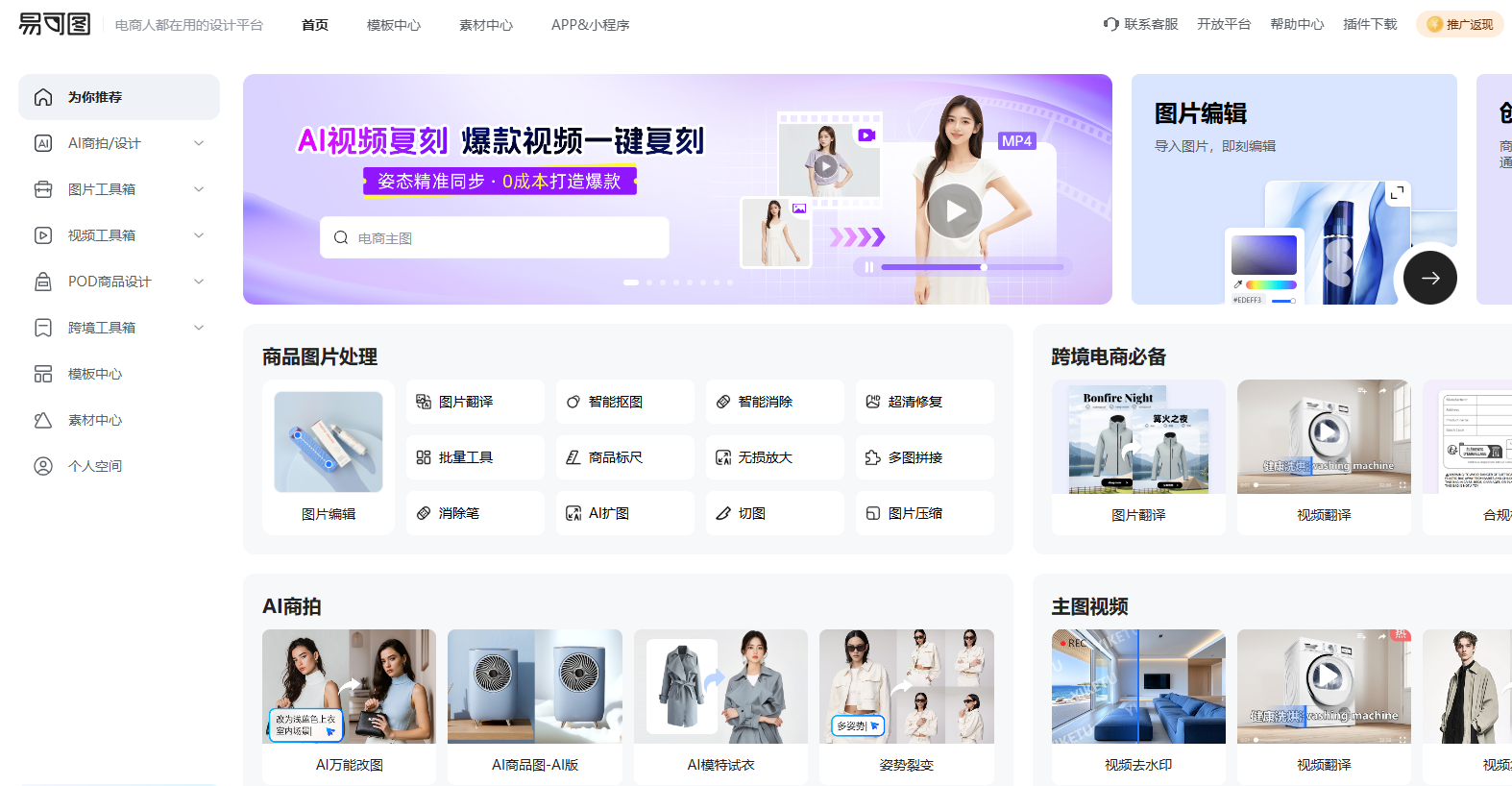 易可图为用户提供了一站式服务,在具备了常规的基础编辑功能外还有着强大的AI能力加持,提供了一系列智能化的功能。
