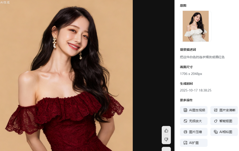 AI万能改图不需要用户手动创建选区或蒙版,只需要你上传需要修改的图片,然后输入一句简单的文字指令,AI便会智能识别指令和图片内容,帮助我们完成就修改,最后生成的图片非常自然准确。