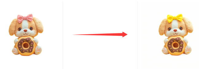 指令如:“把图片中玩偶头上的粉红色蝴蝶结改成黄色,其他部分保持不变”