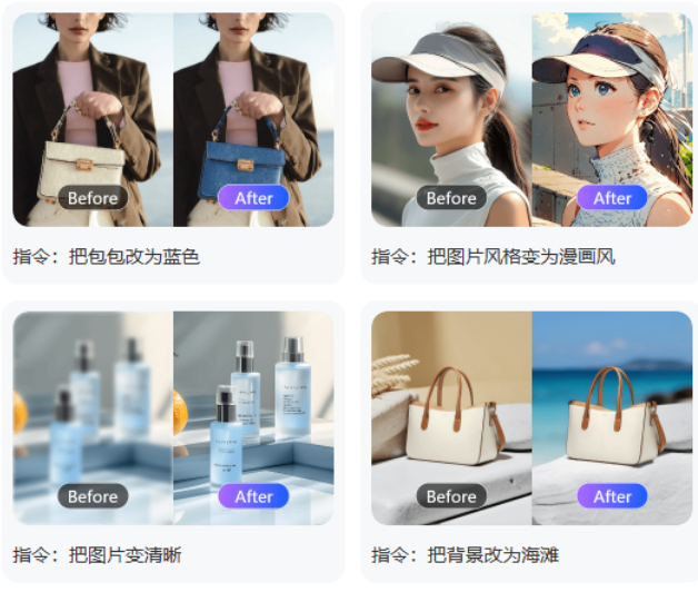全面覆盖所有的编辑功能要求:AI万能改图可以通过指令的形式让使用者轻松得到一个令人惊叹的图片处理效果,如图片换色、换装、去水印、换背景、修图、清晰度修复等等。而对于商家来说,这就意味着可以同时完成对图片中背景替换以及商品颜色的改变还有清晰度的提高等操作步骤,大大提升了工作效率。