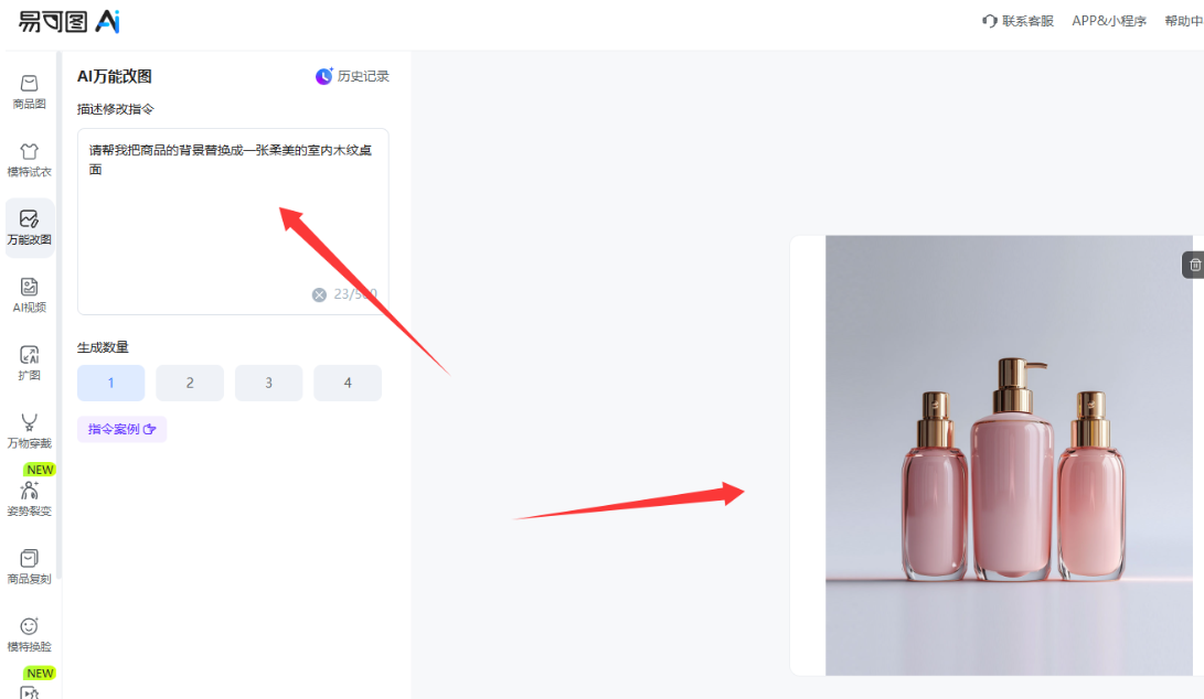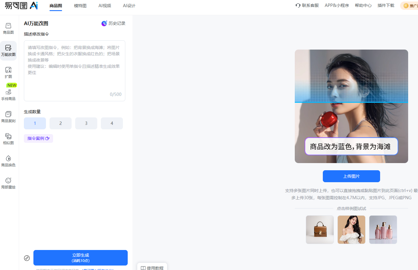 易可图的AI万能改图是一个强大图片处理功能,它能够让使用者通过简单明了的文字指令来达到任何想要的效果,无论是消除、换色还是对复杂图片进行快速、逼真的背景替换,它都可以做到,所以我们如果想给商品图更换背景的话,也可以使用这个功能。