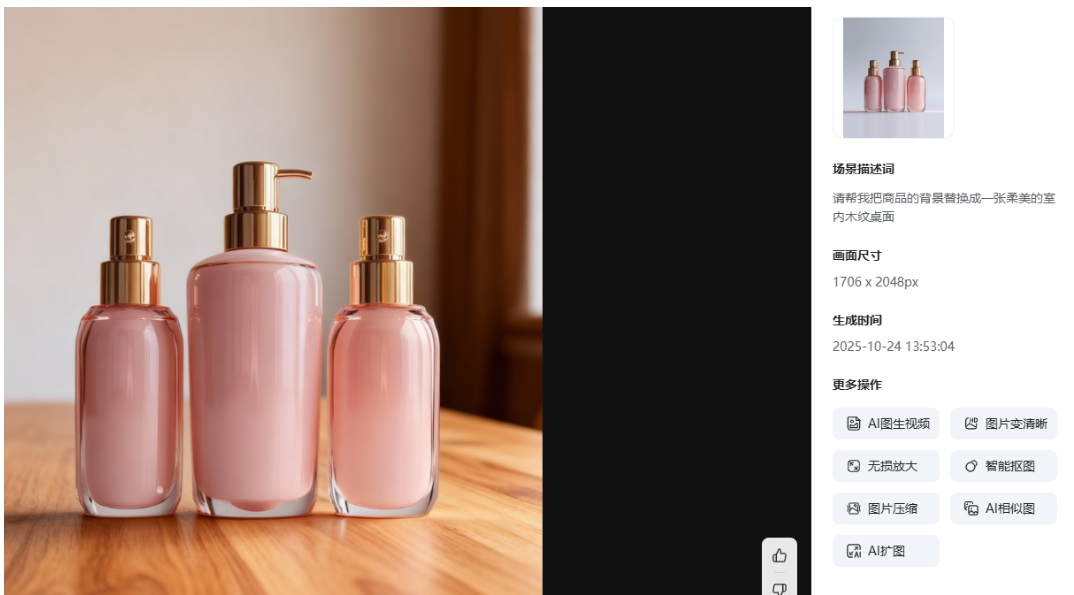 AI万能改图支持一键式自动背景替换,操作极其简便:您只需要在指令描述框里填写简洁明了的文字内容就可以说明你需要将图片里的哪个地方给替换掉比如“请帮我把商品的背景替换成一张柔美的室内木纹桌面”。然后AI就会根据你所指定的内容找到商品主体并生成与商品本身相吻合的光影关系及光照方向的全新背景。
