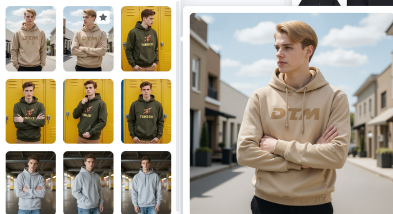 AI 动态姿势和场景搭配:不仅仅是简单的站立静态模特图,还可以随意搭配各种动态姿势比如坐着、走路等等,并且可以给模特搭配任意场景比如街道、咖啡厅或者是大自然中的一些景色,从而快速生成一组有场景氛围的模特套图来满足商品详情页展示或是其他营销需求