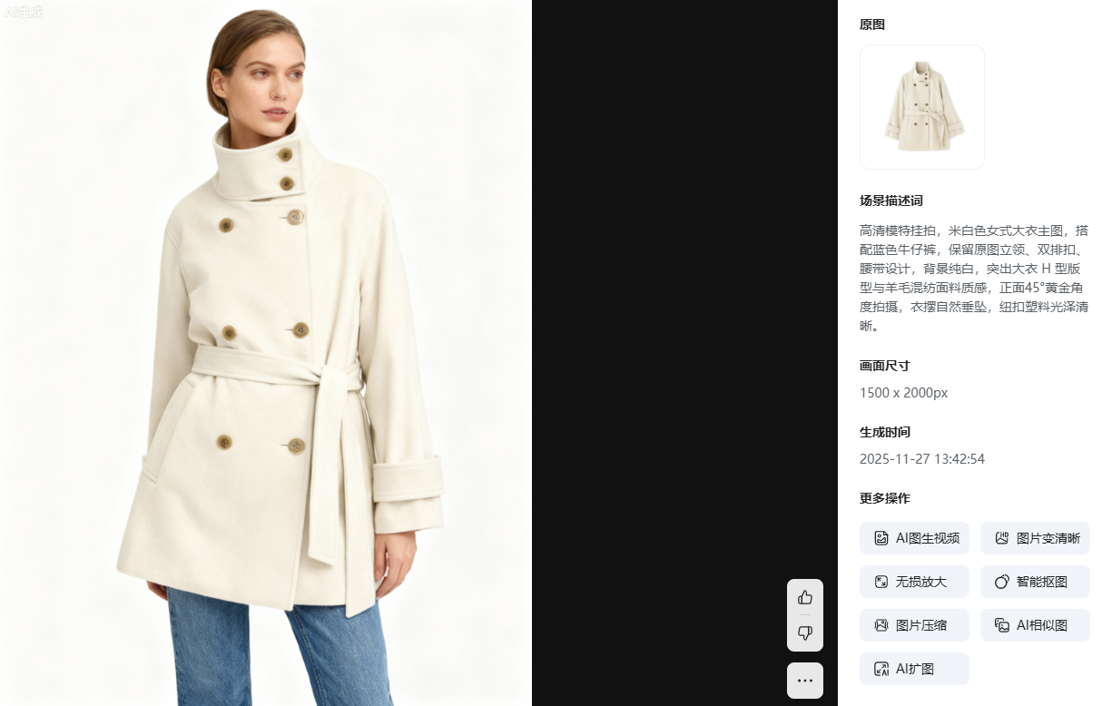 动态姿势+场景搭配:不仅仅只有简单的站立静止的模特图,还能随心所欲地为模特设置多种动态动作如坐姿、走动姿态等等,并且可以给模特配上任意背景环境例如街景、咖啡馆甚至是户外森林风景,进而快速生成一套具有场景气氛的模特套图以满足商品详情页展现或其他营销所需。