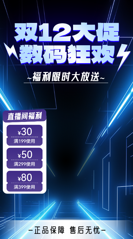 该系列模板主要追求的是视觉上的爆炸冲击感,传达一种“时间所剩不多”、“年末收官”的紧迫感。“科技风”是其关键词之一,“深邃蓝/紫-霓虹灯字-激光切割光束”是其常见的组合方式,并且时常运用到一些故障艺术(GlitchArt)/3D立体字效;除此之外还会结合其他诸如“炫彩渐变”、“荧光夜景”、“电波迷雾”等特效渲染气氛。适用于数码家电、3C电子、运动潮流服饰等类别,凸显“燃爆全场”的“酷劲儿”。