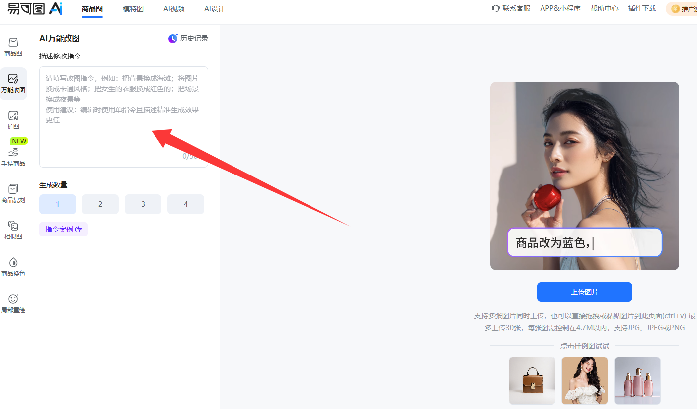首先,我们先打开易可图网站,找到AI万能改图功能。然后,上传您需要精修的原始产品图。再在左侧的指令描述框中,清晰地输入您的修改要求。最后,点击生成,等待AI为您呈现精修后的效果图。