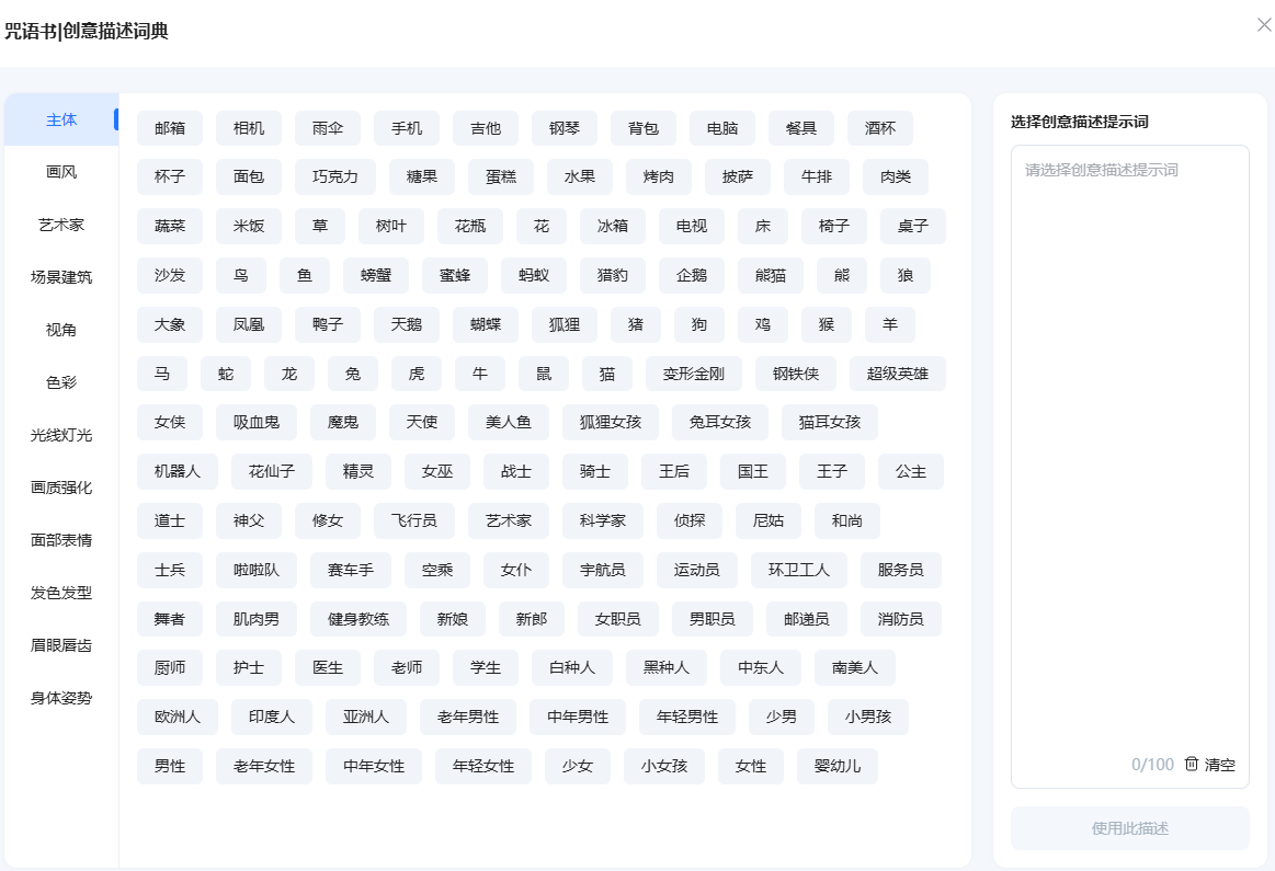 对于不知道该如何描述创意的用户,易可图提供了咒语书功能。里面整理了主体、画风、场景建筑、视角、色彩、光线、画质、人物表情和身体姿势等常见描述方向,方便直接参考和组合使用。