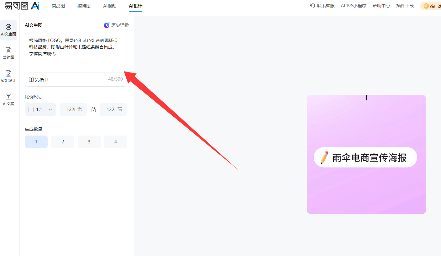 在功能上,易可图的AI文生图支持仅凭文案描述生成图片素材,可用于 logo、海报、商品配图、绘画风格图片等多种场景。用户只需要在输入框中填写提示词,点击生成,即可快速得到图片结果。