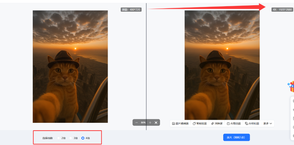 易可图提供了基于 AI 的图片放大与清晰度增强功能,可以在放大图片的同时尽量保留细节。它采用先进的算法智能填补放大后的像素信息,从而减少锯齿和模糊。