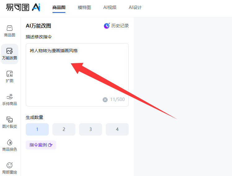 步骤二:在指令描述区域输入需要调整的内容。例如在动漫风格转换场景中,可以输入类似描述:将人物转为漫画插画风格、将图片处理为二次元卡通效果、增强线条表现并简化颜色层次等。