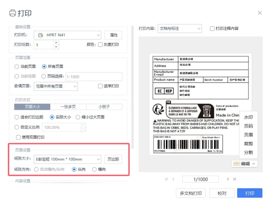 打印时纸张大小需与标签尺寸保持一致,否则会出现打印不全等问题