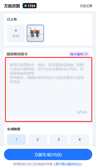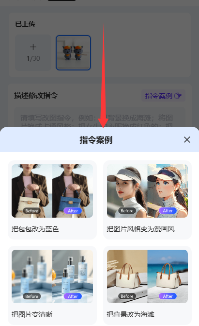 Step2:进入万能改图页面后,我们可以先点击【指令案例】,看看简短的指令是怎么写的。