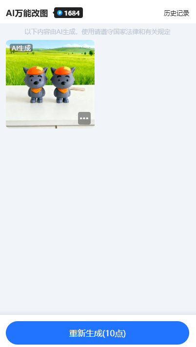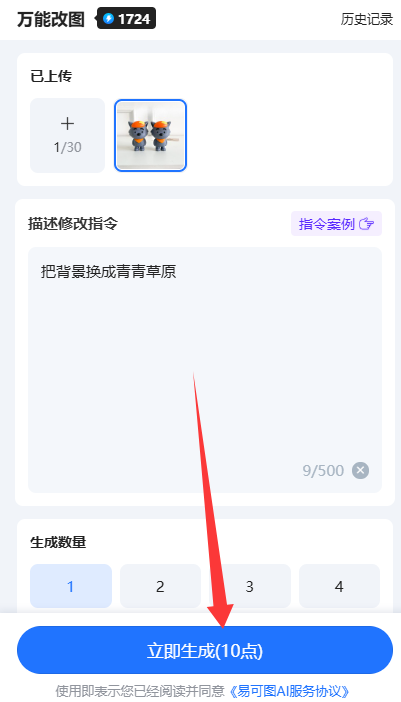 Step4:以当前上传的商品为例,我觉得它的背景太单调了,不够生动,于是我输入“把背景换成青青草原”,生成数量选择1张,然后点击【立即生成】按钮。