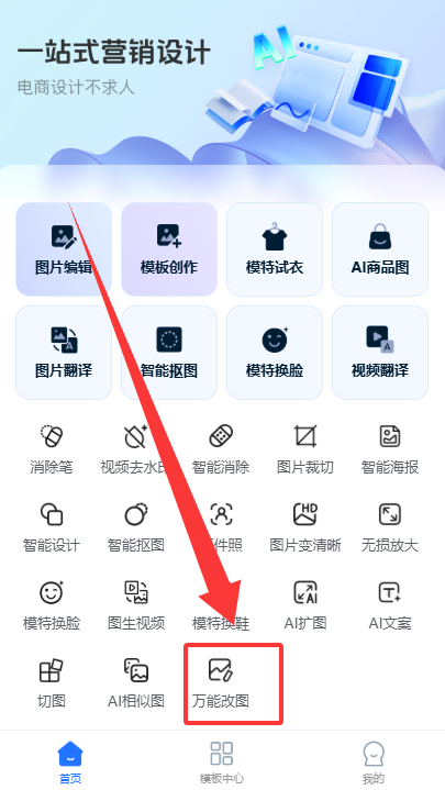 Step1:点击【万能改图】,上传需要修图的图片,这个功能可以实现任意修图、改图需求。