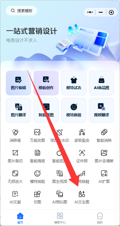 Step1:点击【AI文生图】进入功能页面,这个功能可以用一段文字来生成一张图片,用来生成插画、电商素材等是非常好的选择。