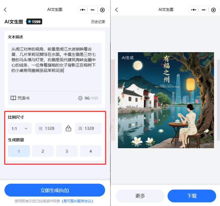 Step5:最后,选择生成的比例尺寸和数量,点击立即生成,稍等片刻,AI就会把图片结果给你啦!