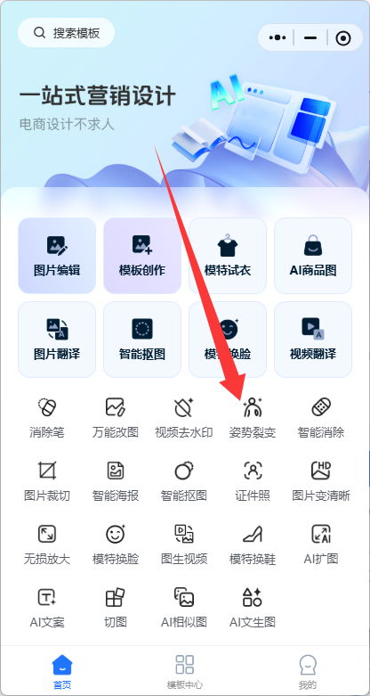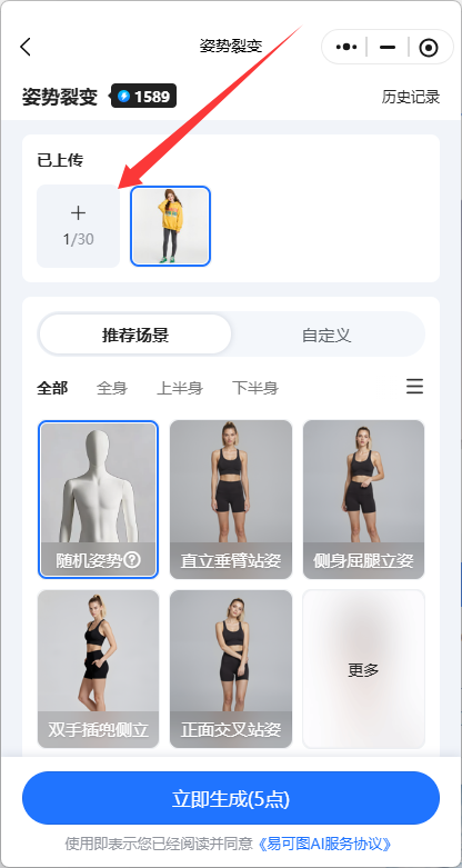 Step1:点击【姿势裂变】进入功能页面,这个功能可以用一张现有模特图片,裂变成不同姿势的一套模特图。