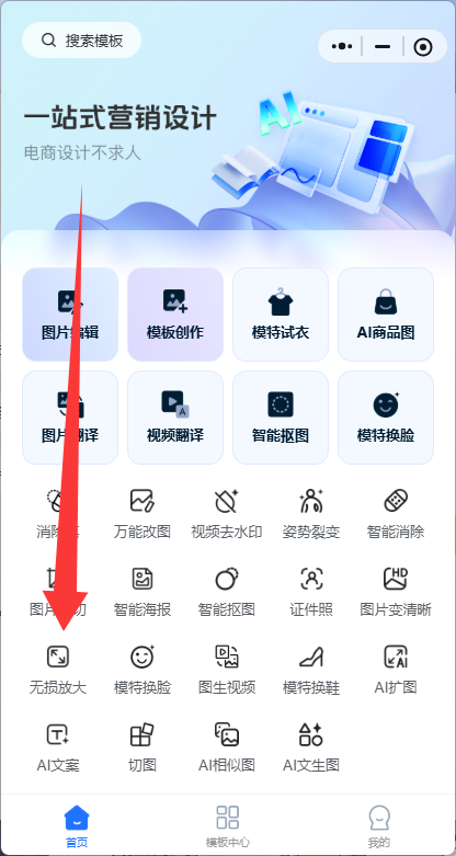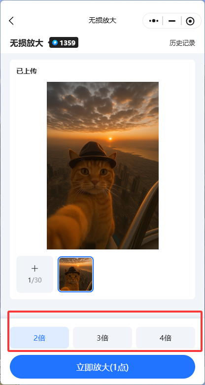 Step1:点击【无损放大】进入功能页面,这个功能可以将一张图片的尺寸进行放大至2、3或4倍,冰尽可能地保存图片的清晰度,不损坏原有的画质。