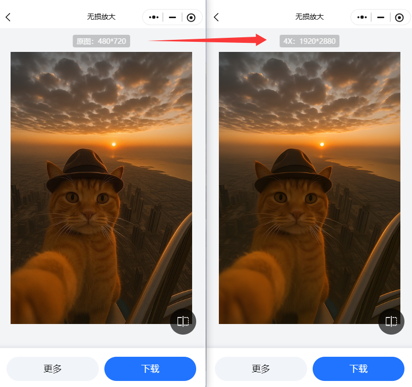 Step4:选好倍数后,点击【立即生成】,稍等片刻,你的图片的尺寸就放大了,并且依然保持着原来的清晰度,不会因为放大变模糊!我们可以看到这种图片放大四倍后,由480*720变成了1920*2880