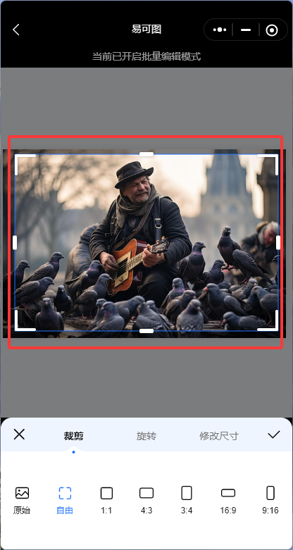 Step3:上传完毕,我们接下来就可以对图片进行裁切了,我们可以先选择下方的图片比例:有原始、自由、1:1和4:3等比例,可以自由选择。