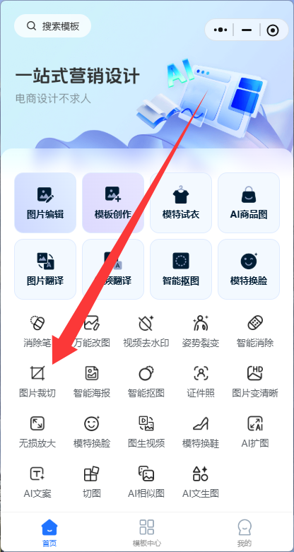 Step1:点击【图片裁切】进入功能页面,这个功能可以将一张图片进行裁剪、旋转和修改尺寸。