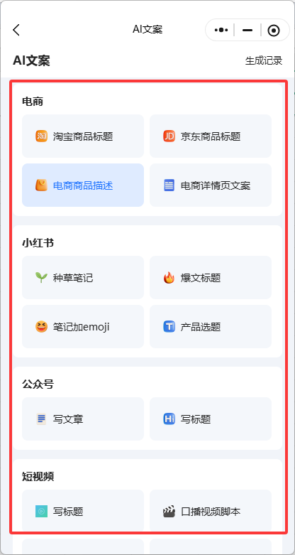 Step2:进入AI文案功能后,我们需要先选择我们需要生成的文案类型,这里有六大类文案类型可供我们选择:电商、小红书、公众号、短视频、朋友圈和社群,每个类型都有细分,下面我就以电商商品描述作为案例来教大家使用。