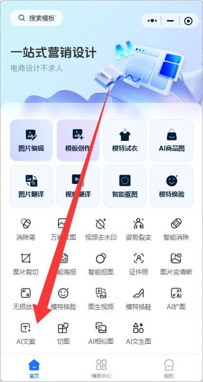 Step1:点击【AI文案】进入功能页面,这个功能可以根据你输入的内容一键生成文案,文案类型包括电商标题、商品描述、小红书种草笔记、公众号文章、视频脚本和朋友圈宣传文案等。