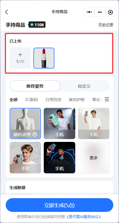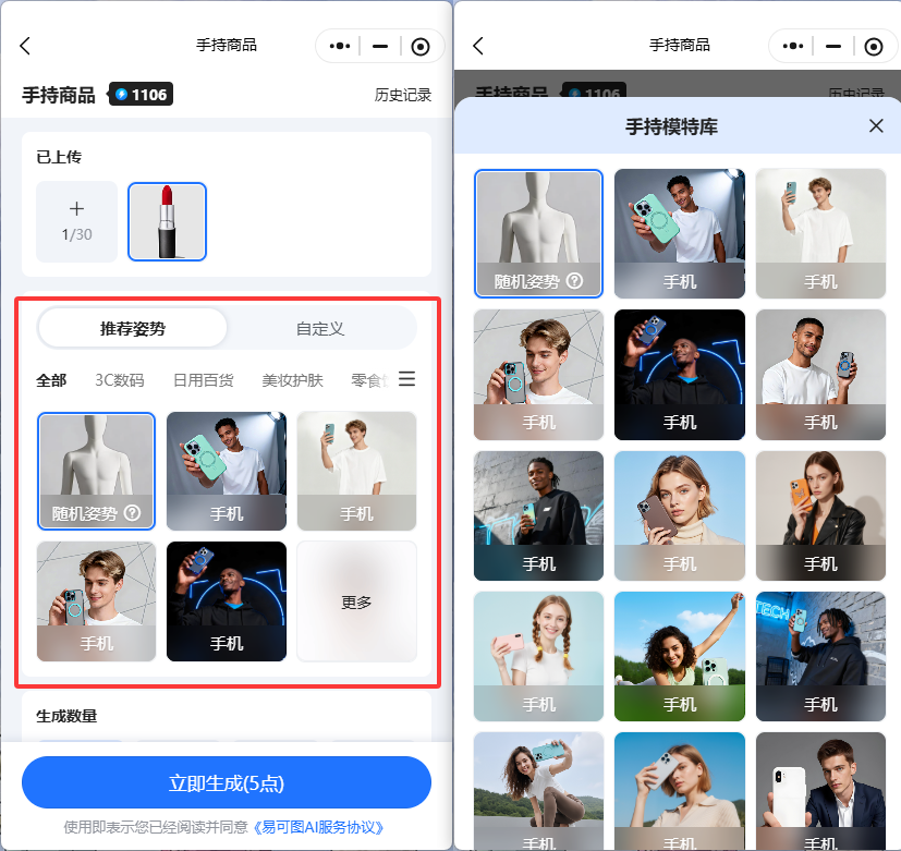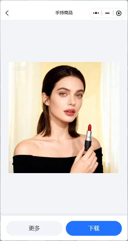 Step4:选择模特完毕,点击【立即生成】,稍等片刻,系统便会生成对应的模特手持商品展示图给你。
