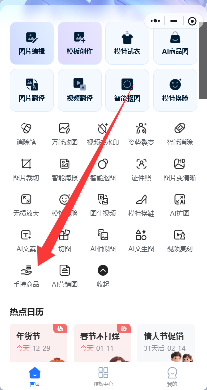 Step1:点击【手持商品】进入功能页面,这个功能可以根据你上传的商品图,一键生成模特手持展示图。