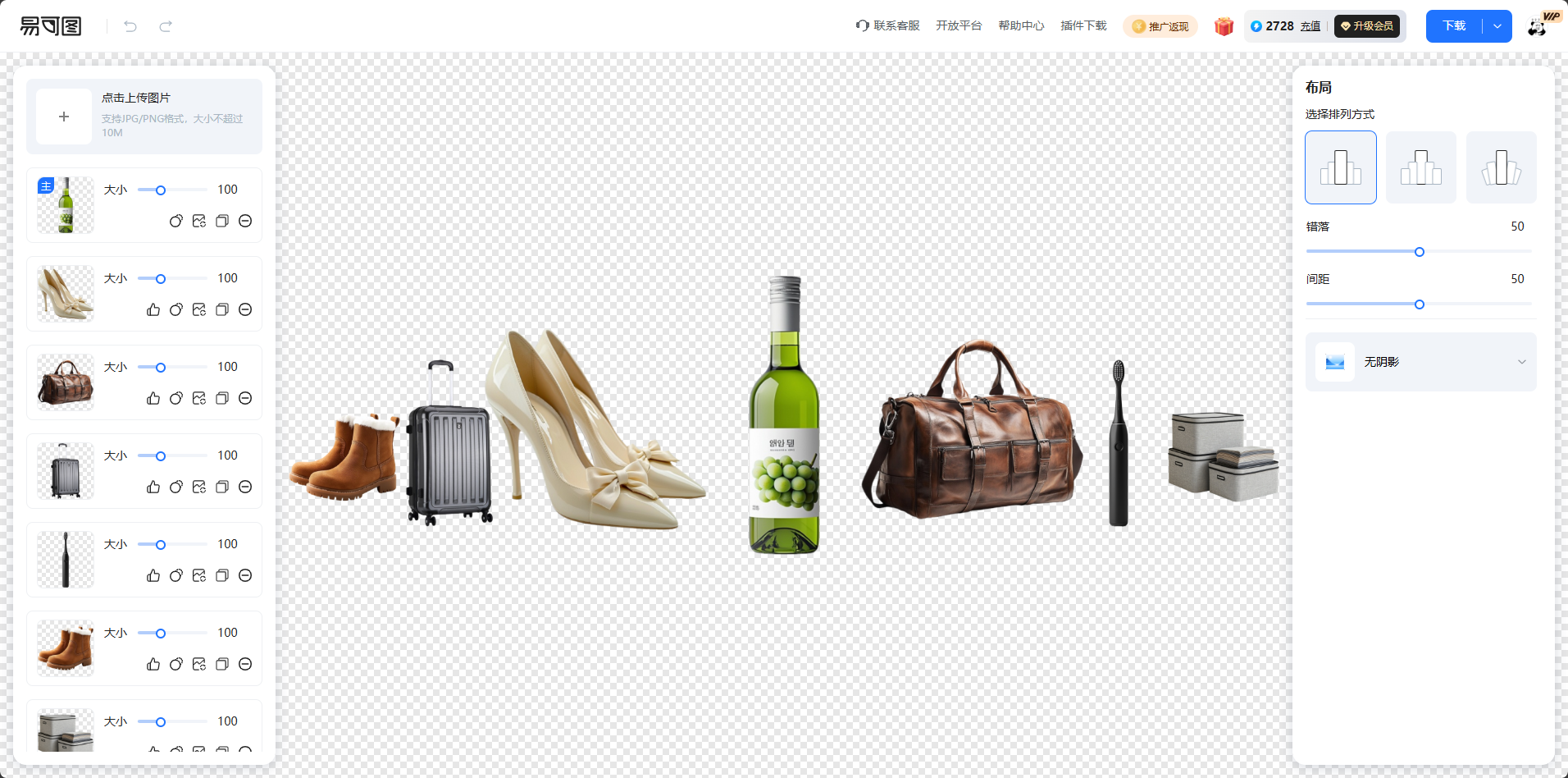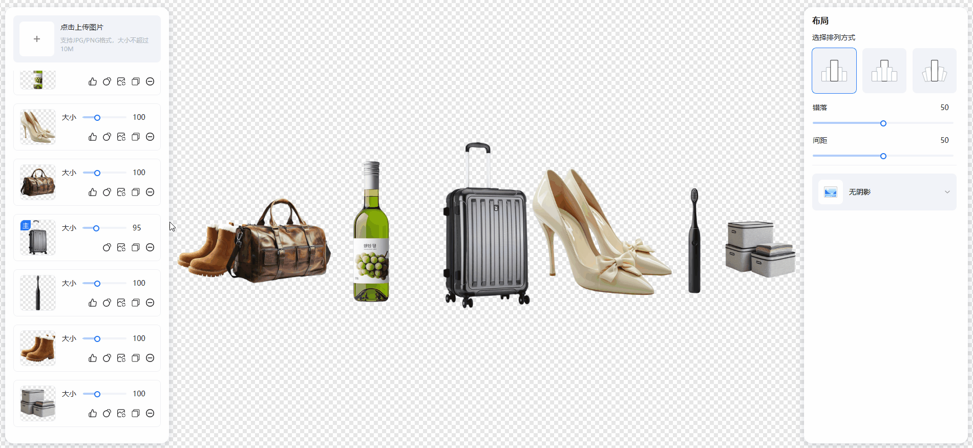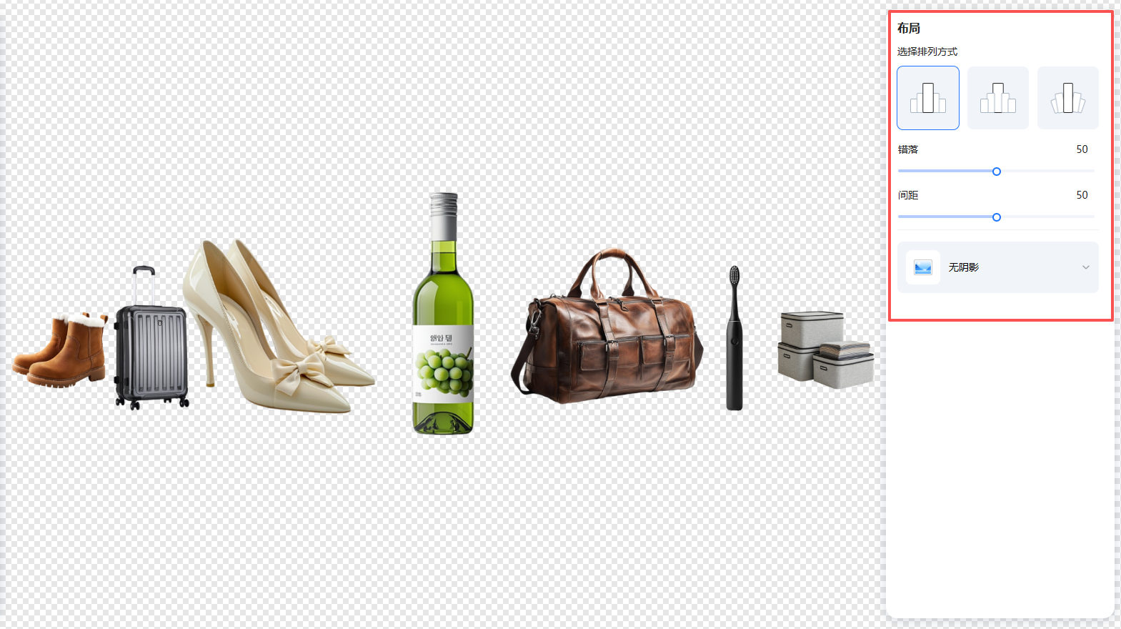 2.右侧可以调整商品之间的布局、错位、间距以及为商品添加阴影效果。