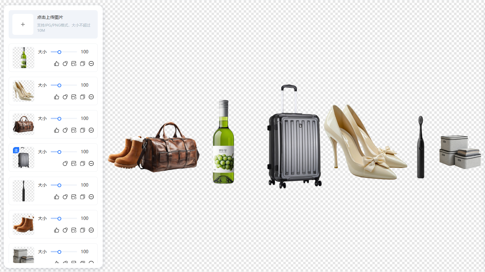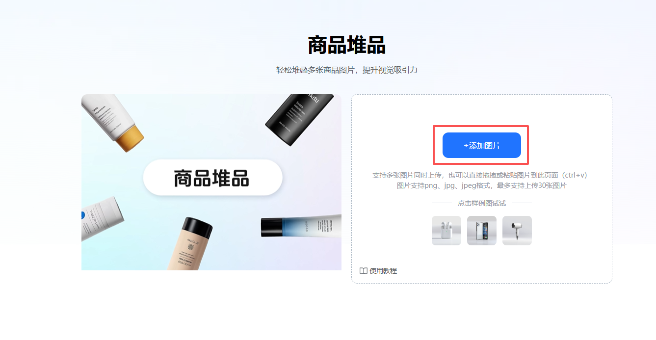1.商品堆品功能支持同时上传30张产品图进行堆叠组合,并且上传完成后会自动抠除产品背景。