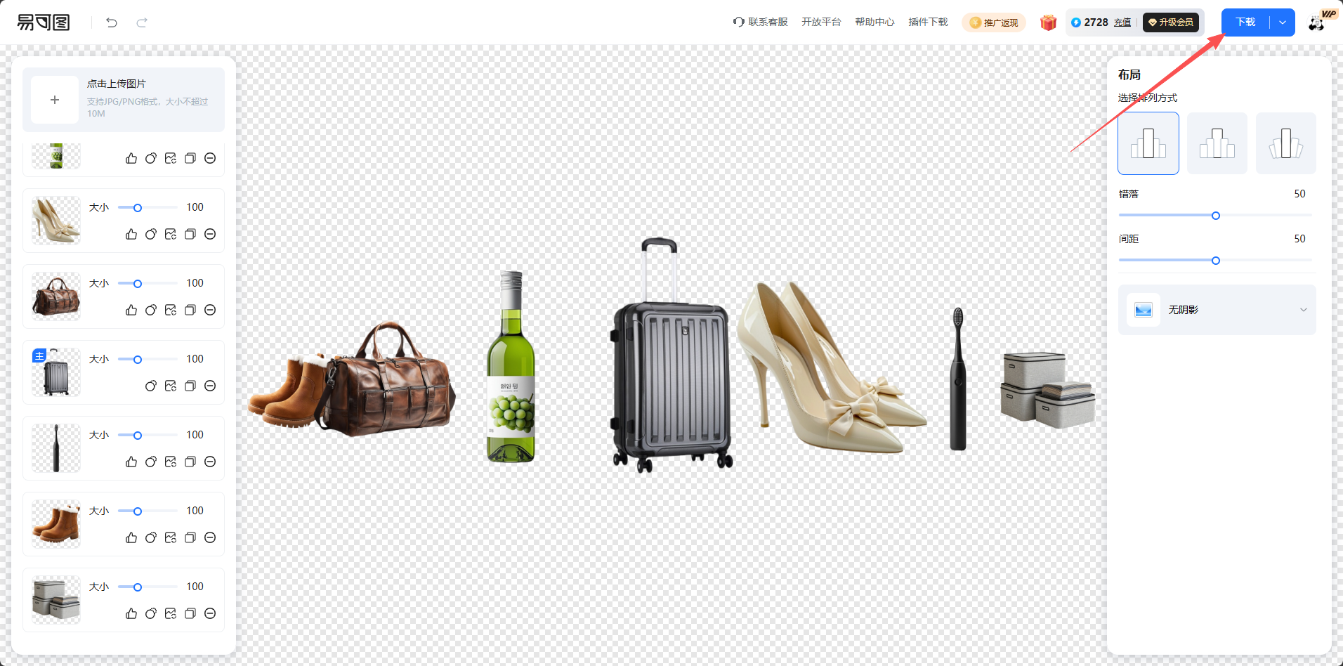 6.同时还支持对同一个商品进行复制、替换,在商品布局组合完毕后,点击右上角下载按钮即可下载商品堆品图。