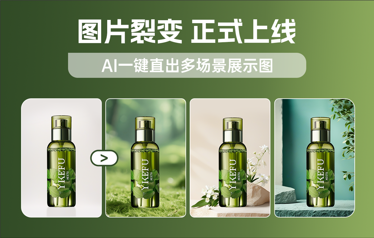 图片裂变功能可以将一张商品图片快速批量裂变为多风格多场景的商品图,帮助电商卖家节约成本,快速完成商品上架前的物料准备。
