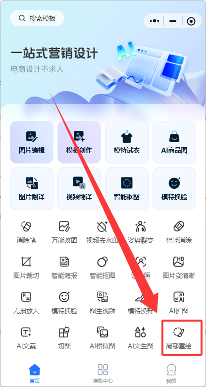 Step1:点击【局部重绘】进入功能页面,可以一键更换图片中的局部元素,无需专业修图技能,轻松实现图片局部的修改。