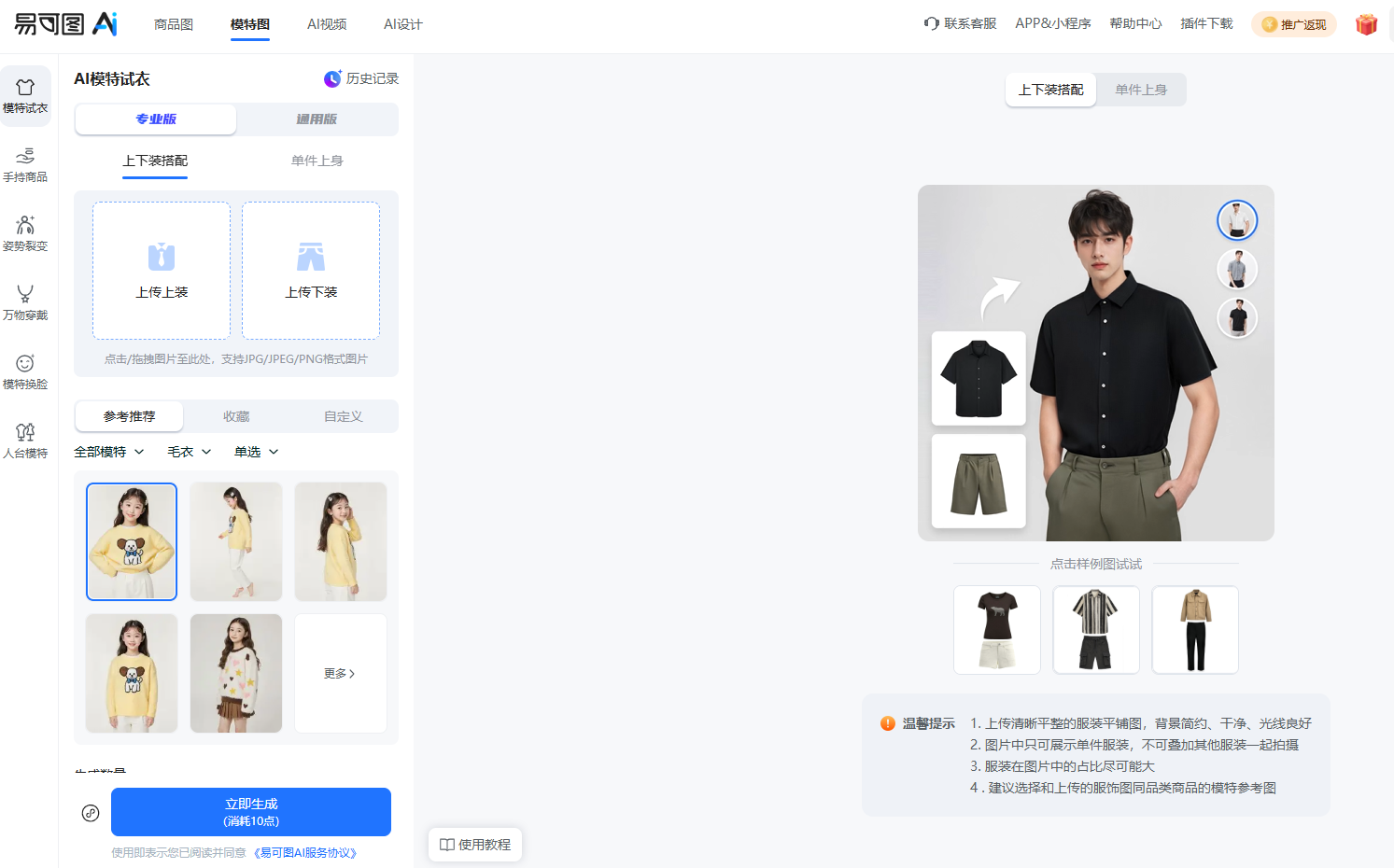 AI模特试衣目前有两个版本:专业版和通用版。这两个版本的模特数量和姿势是相同的,区别在于专业版使用的模型更好,生成效果也更好,同时消耗的点数也会更多,您可以根据需求选择版本使用。