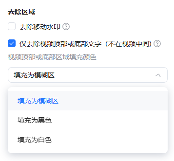 仅去除视频顶部或底部文字:功能会去除视频中顶部和底部的水印,一般用于去除视频中的字幕,勾选时可以选择去除水印后将水印区域填充的样式
