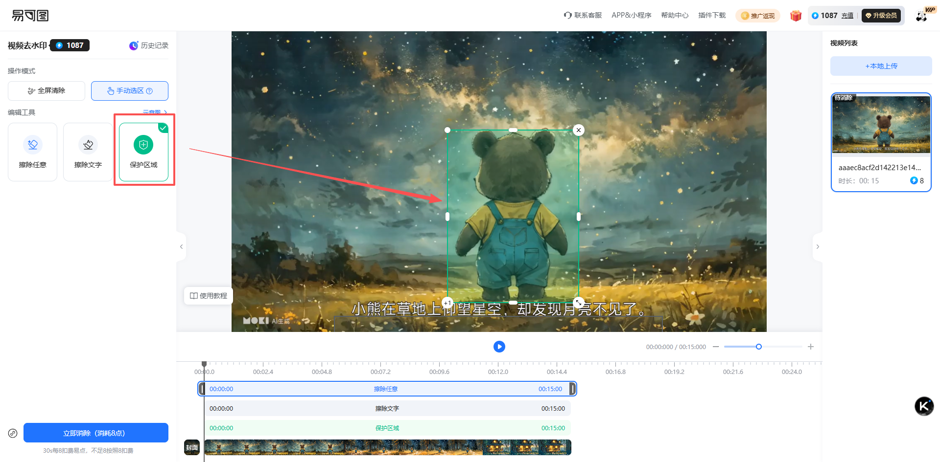 保护区域:功能不会去除保护区域内的内容,一般用于框选需要保留的画面内容