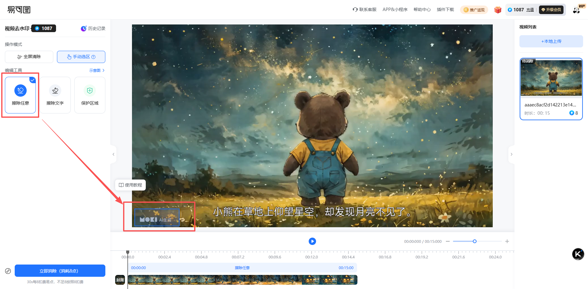 擦除任意:通常用于擦除视频中的logo、图案等标识